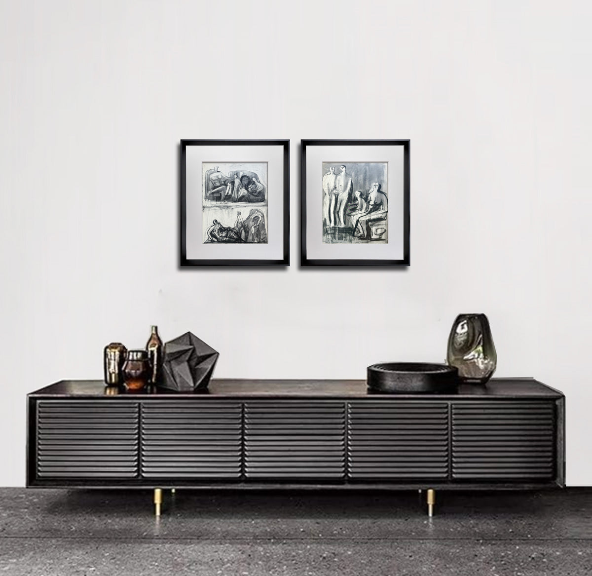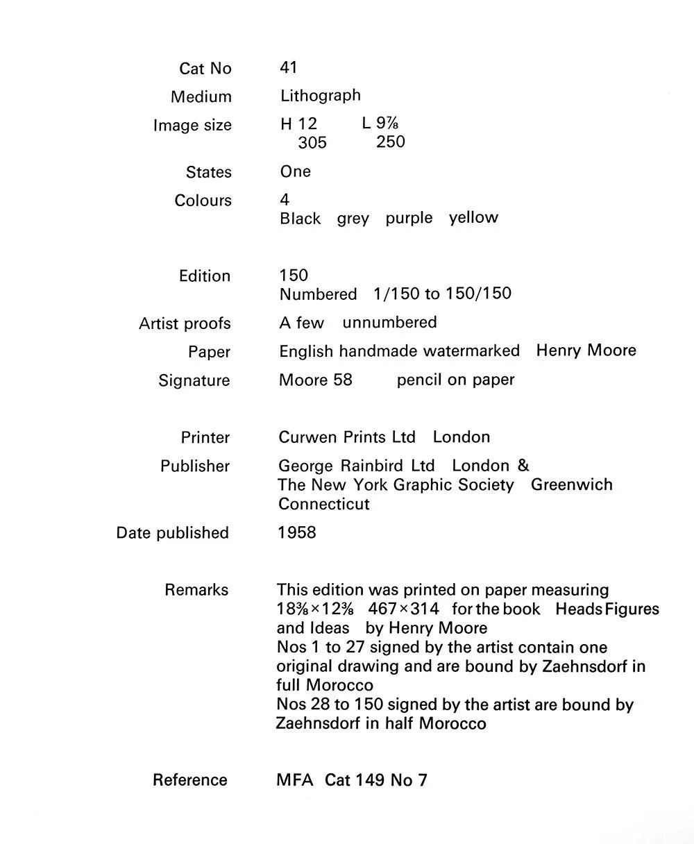 2 Limited Edition Henry Moore Lithographs, 1958 - Set of 2. (UNESCO Group Family and study). This is a limited edition lithograph 2pc set, numbered 107 out of 150 (see justification image). Proofed in England at The Curwen Press, London, 1958. These pieces are catalogued by Cramer (c41), with the reference included with the artwork. The artwork comes with gallery-prepared documentation, including a Gallery Certificate of Authenticity, prepared catalogue reference (c41), justification copy, and provenance.