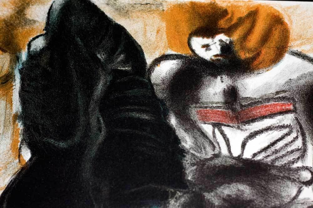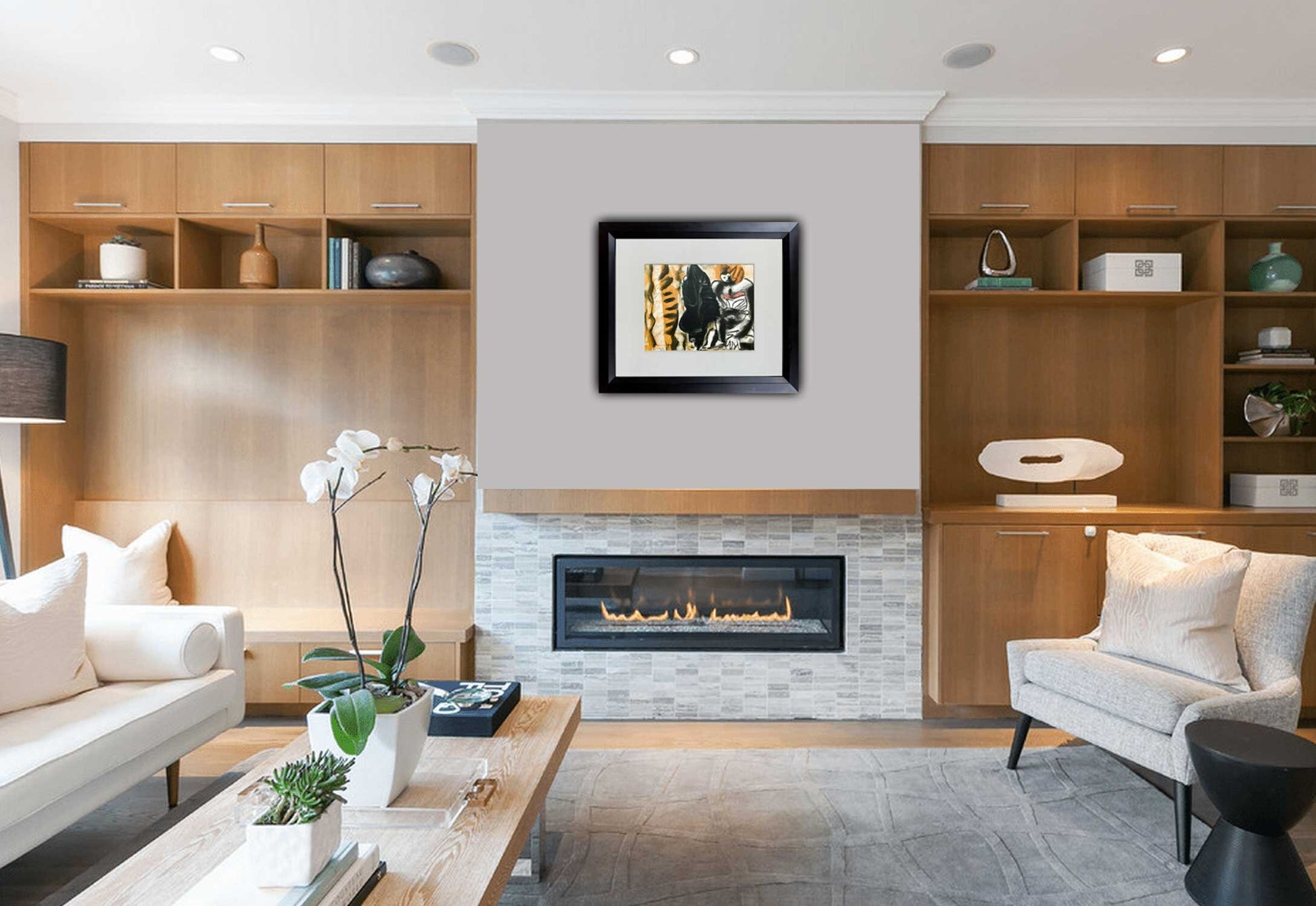 Professional custom cut and sized frame. Material used: Solid wood moulding, Crescent™ Acid Fee Museum Rag Mat™ + acid free backing and TruVu™ UV Protection Anti Glare Museum™ Glass. Modern Now's in-house framer constructs all of the archival framing to match the same specification of the artworks that are hung in the gallery for the preservation and protection of your artworks.