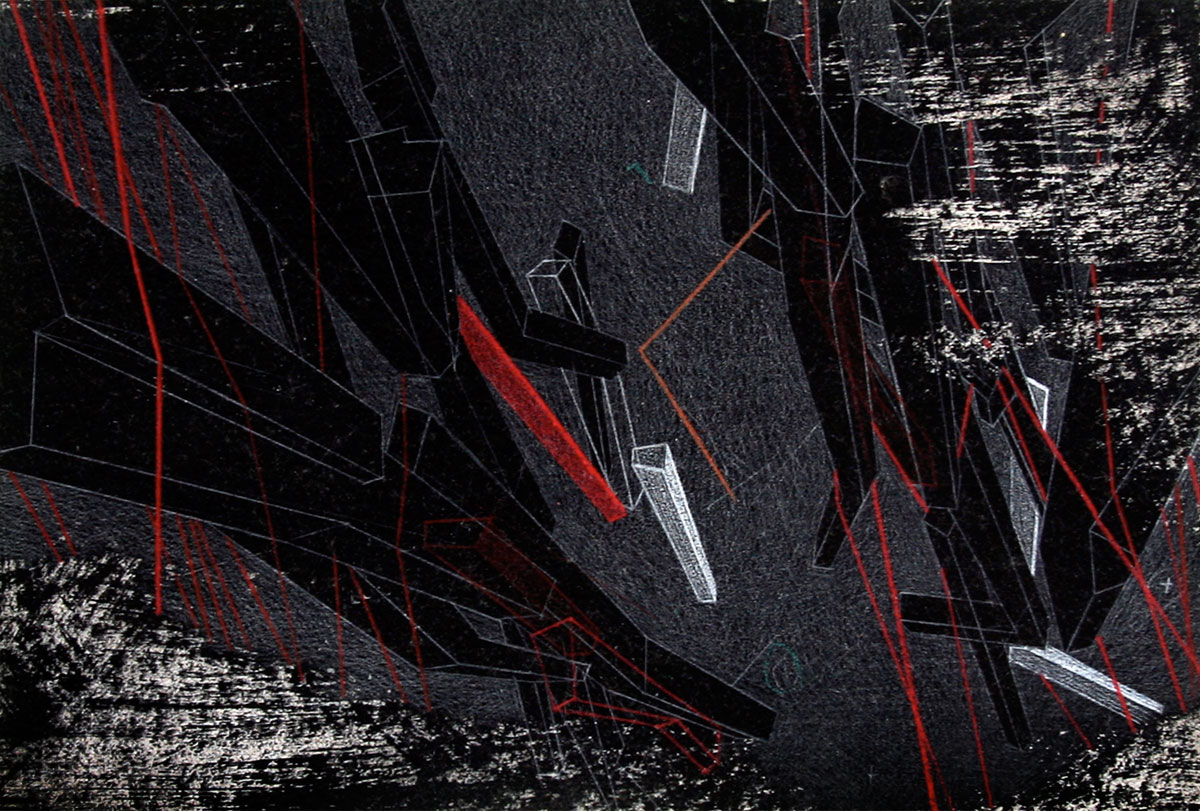 This is an extremely important artwork hand drawn by well-known architect, Lebbeus Woods, and is the only one created and gifted to his assistant Piotr Redlinski, of which the director purchased for his collection and has just released it into the gallery for clients to be able to add to their collection. Woods did create additional hand-drawn etchings, however, these are held in museums (MOMA for one) and institutions and are not for sale, so this is a rare opportunity to have in ones collection.