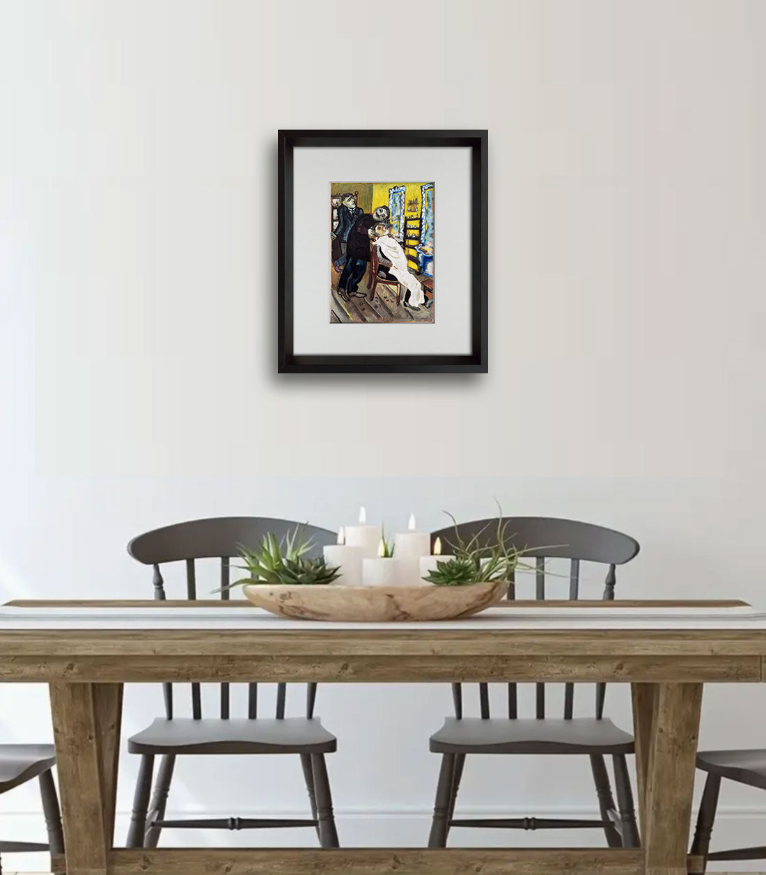 Professional custom cut and sized frame. Material used: Solid wood moulding, Crescent™ Acid Fee Museum Rag Mat™ + acid free backing and TruVu™ UV Protection Anti Glare Museum™ Glass. Modern Now's in-house framer constructs all of the archival framing to match the same specification of the artworks that are hung in the gallery for the preservation and protection of your artworks.